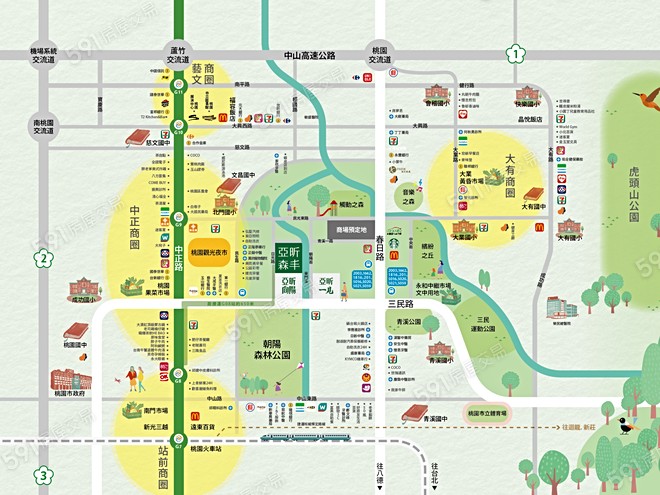 環境:「亞昕森丰」位於桃園市桃園區小檜溪重劃區,鄰近站前商圈及中正商圈,生活機能佳。