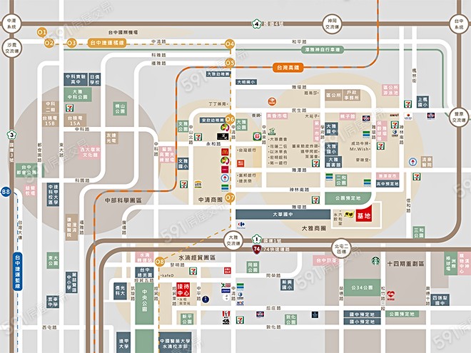 位置:「坤聯發大雅匯」基地周邊多為透天,中高樓層以上視野棟距佳。社區規劃:零店面純住宅,且低梯戶比1:2,均質3房設計,社區質感佳。