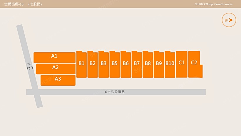 A1~A3戶為臨路戶別前院停車規劃,B1、B2、B3、B5、B6、B7、B8、B9、B10戶室內格局對稱相仿,客廳及臥室均有開窗; C2戶可停2台車。