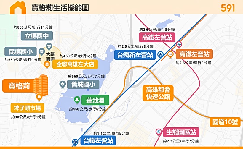 交通:鄰近高雄都會公路,可通往左營高鐵站與國道10號,交通機能便利。