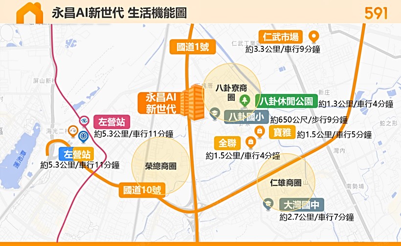 • 商業:車行10分鐘到榮總商圈,9分鐘到仁武市場、5分鐘有寶雅、4分鐘抵八卦寮商圈及全聯。