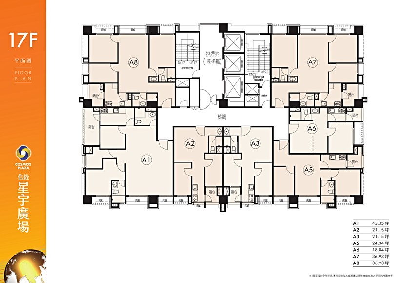 本案17層平面圖單層7戶配3部電梯,梯戶比1:2.3,屬低梯戶比,其中A1、A7、A8戶為3房格局,A7、A8戶格局對稱相仿,此3戶都是雙面採光;A2、A3、A5戶為2房格局,而A2、A3戶格局對稱相仿,此3戶都是單面採光;A6戶為1房格局、單面採光。