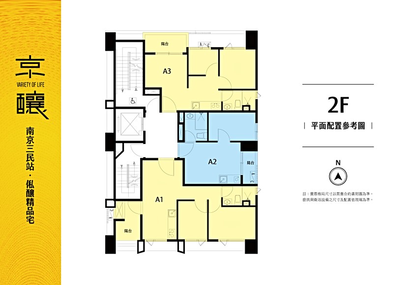 「京釀」基地位於南京東路五段291巷35弄24號旁,面積69.87坪,規劃1棟地上8層、地下2層之華廈建築,全案共22戶住家,屬於小型純住社區,車位則為機械式8個,車位配比1:0.36,社區公設比38.88~38.89%;從2樓平面配置圖來看,為單層3戶1梯的配置,梯戶比1:3;格局部分,A1、A3為雙面採光設計,A2則為單面採光設計。