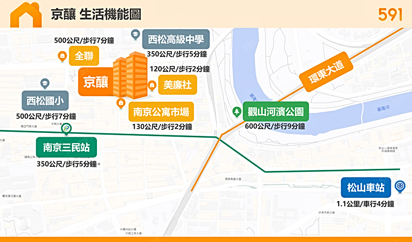 步行5分鐘可達捷運南京三民站,車行4分鐘亦可至台鐵松山車站,周邊亦有環東大道可利用。