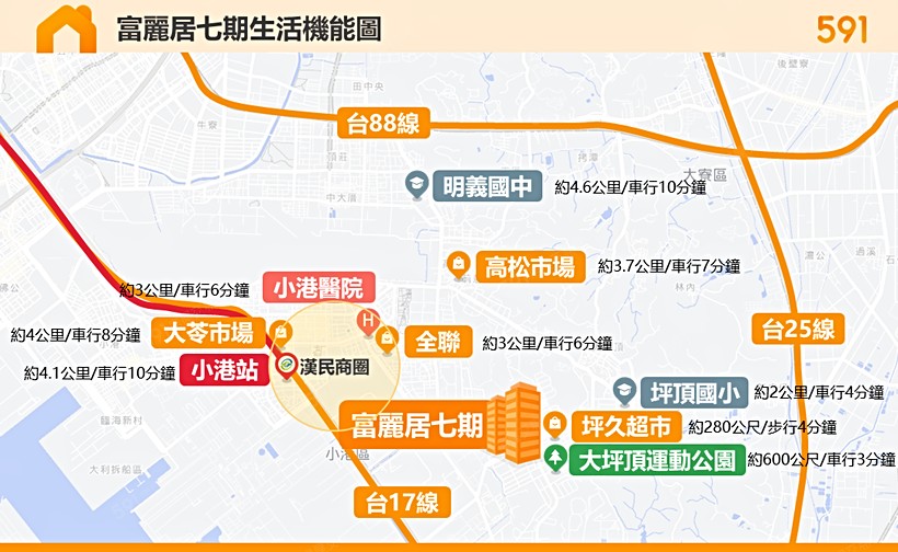 - 商業:距離高松市場、漢民商圈約車行7分鐘、大苓市場8分鐘,全聯6分鐘,步行4分鐘則有坪久超市。