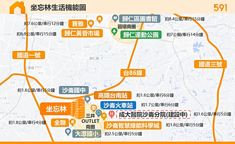 距離高鐵台南站及沙崙火車站約車行6分鐘,距離台86線約2分鐘、國道一號5分鐘,國道三號10分鐘。