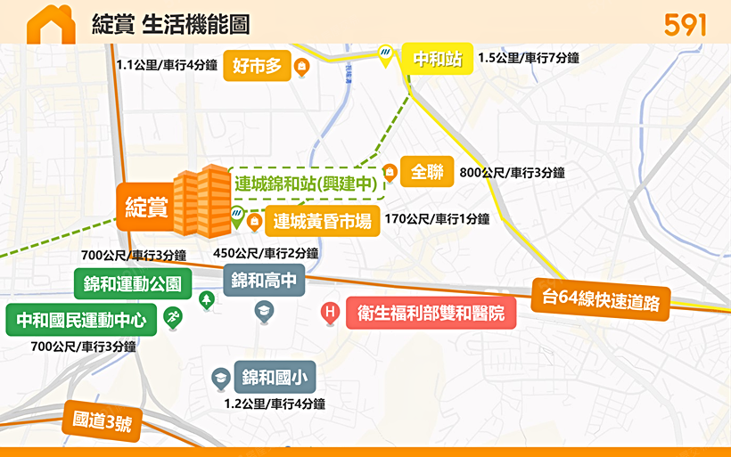 - 休閒:車行3分鐘即可達錦和運動公園、中和國民運動中心。