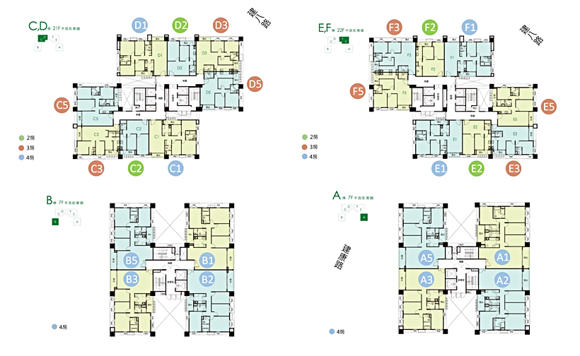 社區有1~4房產品,標準層平面圖為2~4房,其中A、B棟,規劃單層4戶2梯的配置,梯戶比1:2,屬於低梯戶比,而C與D棟和E與F棟,則是建築相連但不相通,以各棟來看,也都是4戶搭配2梯,梯戶比同樣為1:2,亦屬低梯戶比。