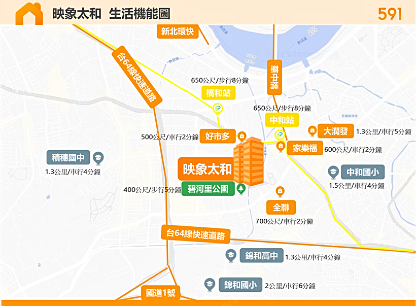 學校:車行4分鐘可至中和國小、積穗國中和錦和高中,車行6分鐘則可至錦和國小。