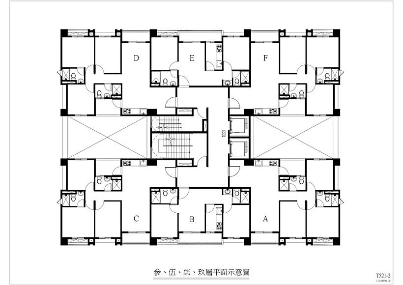 從標準層平面圖來看,為單層6戶2梯配置,梯戶比1:3;細看格局規劃,A、C、D、F格局相似,為三面採光,B、E格局亦相似,則為單面採光。