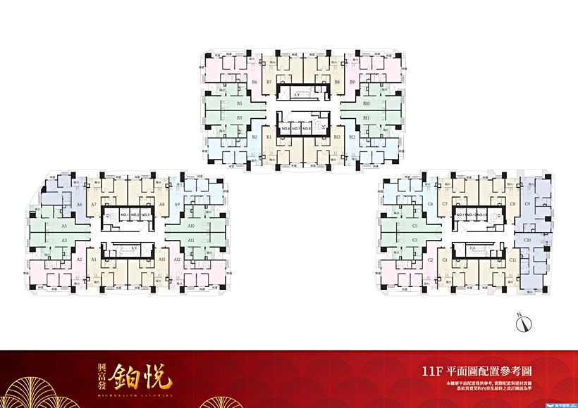公設比34.2%,除了基本的接待大廳,另有空中花園、交誼廳、閱覽室、游泳池、瑜珈教室等。住宅標準層平面規劃,A、B棟單層12併搭配3部電梯,梯戶比約1:4,C棟10併配置3梯,梯戶比1:3.3,由於戶數較多,尖峰時間等待電梯可能較久。格局坪數方面,規劃2房24坪、3房39坪。觀察各房型分布,A5、A3、A10、A11、B3、B5、B10、B11、C3及C5戶均為2房對稱格局;A2、A12、B6、B9、C2戶皆為邊間3房相似格局;A1、A13、A7、A8、B1、B3、B7、B8、C1、C11、C7、C8戶均為2房、鏡射格局;A9、B2、B12、C6戶規劃3房類似格局。