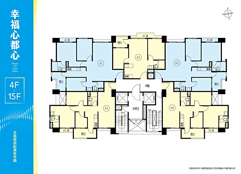 樓層規劃地上15層、地下2層建築,共有67戶住家、11戶透天,屬小社區,坪數規劃2房(22.67坪)、3房(30.42、35.35坪)格局產品。車位規劃92個平面式車位,車位配比1:1.18,符合一戶一車位規劃。本案4-15樓平面圖,單層5戶配兩部電梯,梯戶比1:2.5屬低梯戶比,且梯廳有開窗,通風採光佳:A1與A3、A5與A6格局分別對稱相仿,皆為3房雙面採光格局,A2戶為2房單面採光,各戶型房間及客廳皆有開窗。