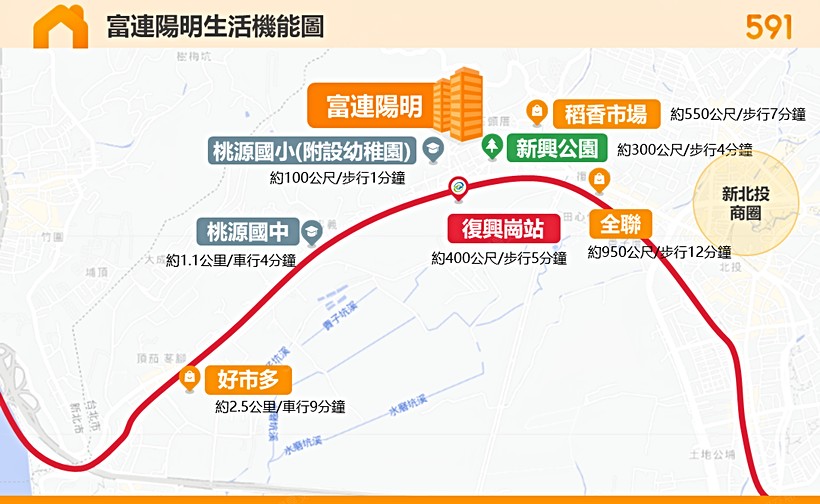 商業:至新北投商圈約車行4~5分鐘,至好市多約車行9分鐘,步行12分鐘抵全聯、7分鐘至稻香市場。