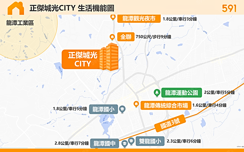 - 商業:步行9分鐘即可至全聯(龍潭中豐),車行4分鐘則可達龍潭傳統綜合市場,另外,車行3分鐘也可至龍潭觀光夜市,