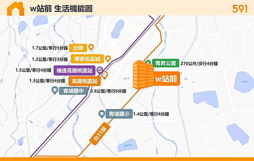 環境:「w站前」位於青埔特區內,重劃區街廓整齊、環境新穎。