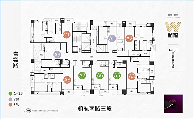從4-18樓標準層平面圖來看,社區規劃1+1~3房產品,為單層9戶3梯的配置,梯戶比1:3,屬於一般梯戶比;格局部分,A2、A8為三面採光,A3、A10為雙面採光,A1、A5、A6、A7、A9則為單面採光,其中A5、A7格局相似。