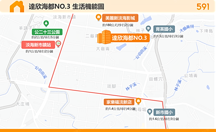 「達欣海都 NO.3」位於淡海新市鎮,義山路三段、新市五路三段交口,周邊多新大樓社區,街廓整齊畫一。