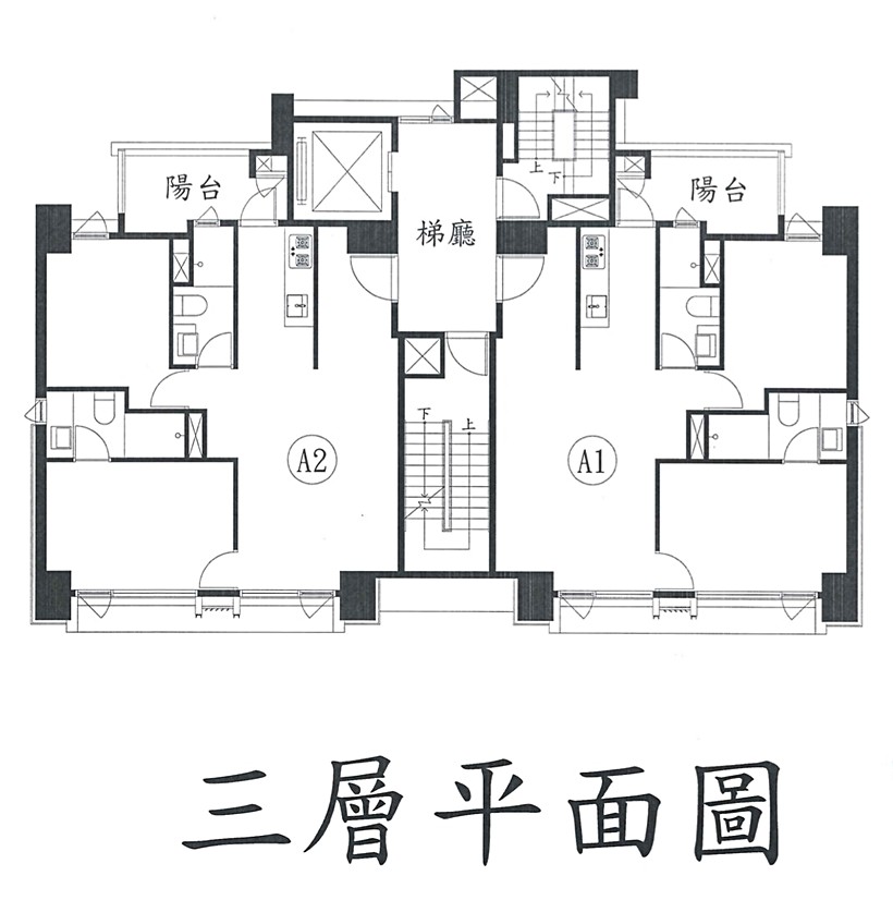 樓層規劃地上13層、地下2層,單層2戶配一部電梯,梯戶比為1:2,屬低戶比,坪數規劃為2房36坪,A1、A2戶格局對稱相仿,三面採光,客廳、臥房、衛浴皆有開窗,採光通風佳。