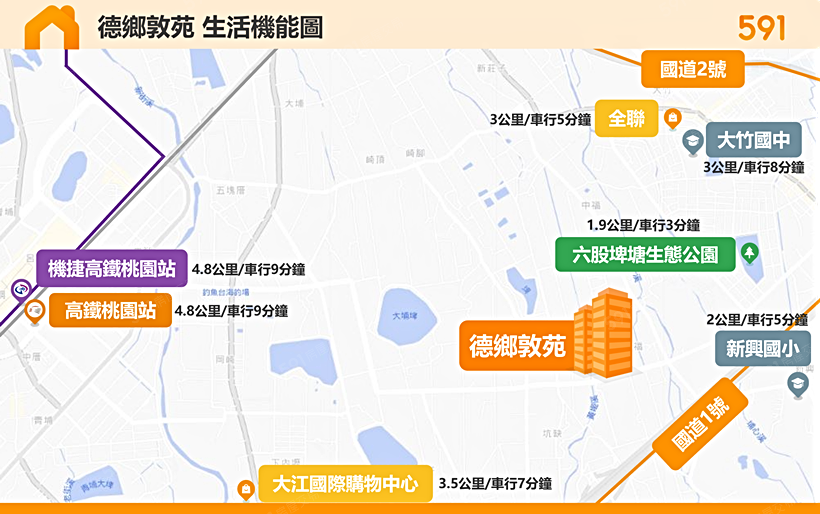 - 商業:車行5分鐘可達全聯(蘆竹大竹),車行7分鐘亦可達大江國際購物中心。