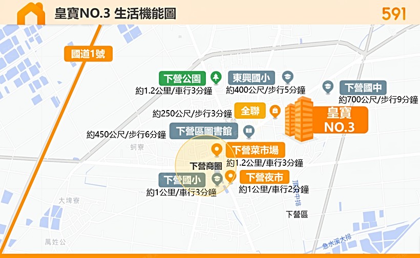 - 休閒:步行6分鐘有下營區圖書館,車行3分鐘則有下營公園。
