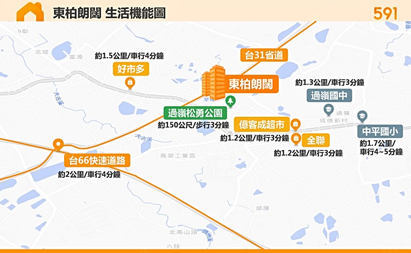 學校:車行約4~5分鐘可扺達中平國小,車行約3分鐘則可至過嶺國中。