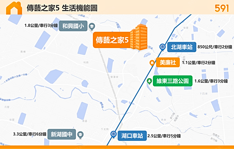 學校:車行3分鐘可達和興國小,車行6分鐘亦可至新湖國中。