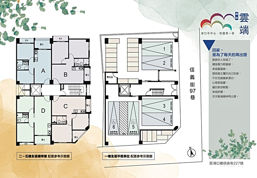 「福田雲端」基地位在信義街巷內,面積116.46坪,規劃1棟地上5層的電梯公寓,全案共16戶住家,屬於小型純住宅社區,車位則為平面式6個,車位配比1:0.38,社區公設比22.9%;從2~5樓標準層來看,為單層4戶1梯的設計,梯戶比1:4,戶戶皆為兩房一衛格局,採雙面採光設計。