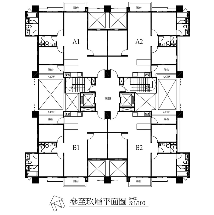 從3-9樓平面圖來看,為單層4戶2梯的配置,梯戶比1:2;格局方面,A1、A2、B1、B2格局相似,戶戶皆為3房三面採光設計。