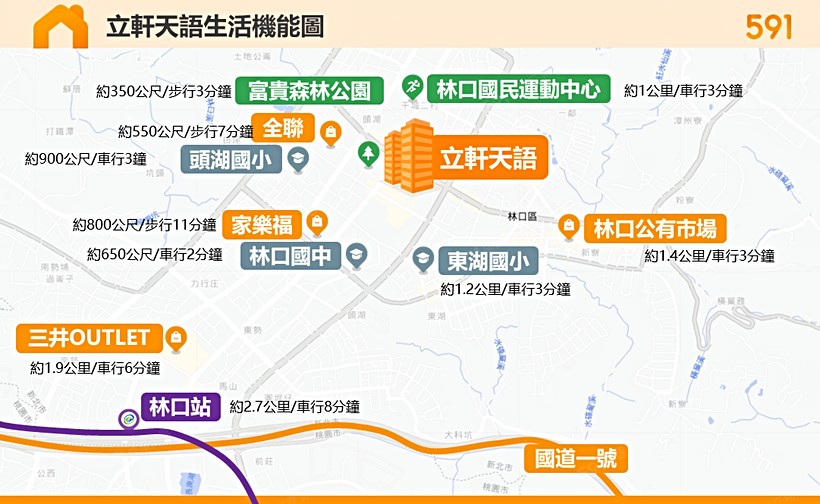 距離國道一號林口交流道約車行10分鐘,至機場捷運林口站車行8分鐘。