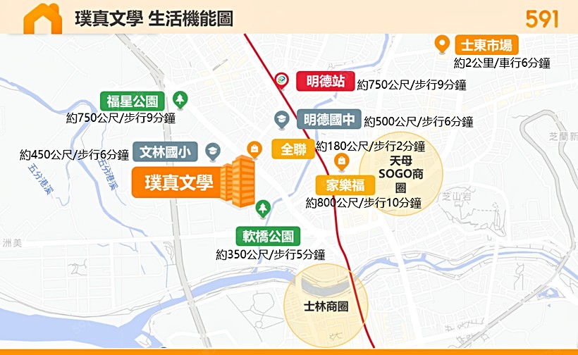 - 商業:至全聯約步行2分鐘、家樂福及天母SOGO商圈10分鐘,車行6分鐘可抵士東市場、士林商圈。