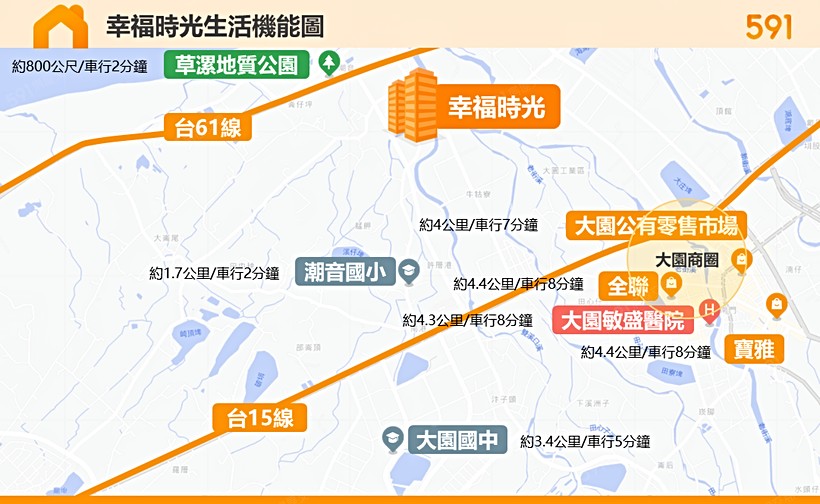 - 商業:至大園商圈約車行6分鐘,距大園公有零售市場7分鐘、全聯及寶雅也約8分鐘。