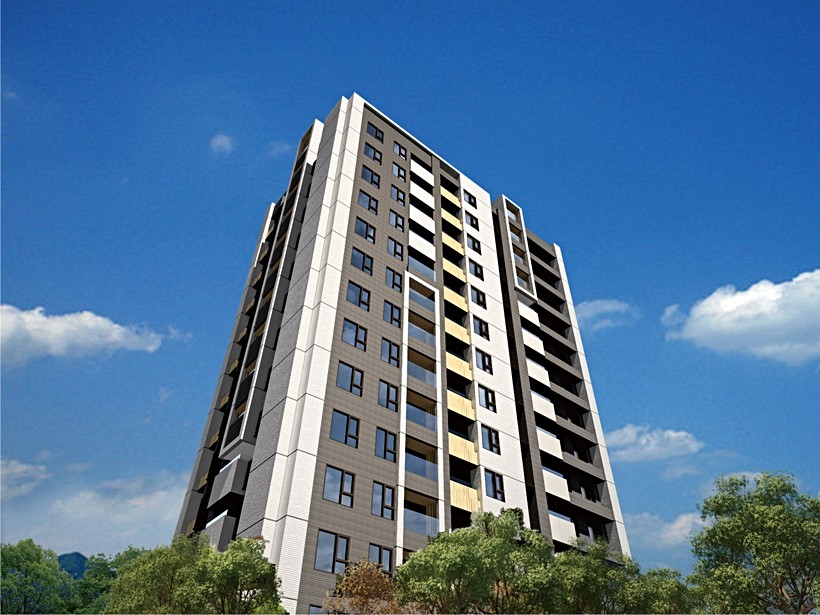 樓層規劃為地上14層,地下4層建築,共有65戶住家、1戶店面,屬小型社區,格局坪數規劃2房(25~27坪)、3房(30、36、41坪)。車位共規劃75個平面車位,車位配比1:1.14,符合1戶1車位規劃。本案3-5層平面圖單層5戶配2部電梯,梯戶比1:2.5,屬一般梯戶比;其中B為2房格局、單面採光;D為2房格局、雙面採光,A、C、E戶為3房格局、雙面採光,所有戶型房間皆有開窗,公共空間梯廳也有開窗,採光通風佳。