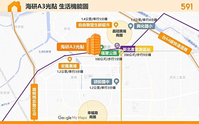 - 學校:車行4分鐘、距離1.3公里可至興化國小,車行3分鐘、距離1.2公里則可至頭前國中。