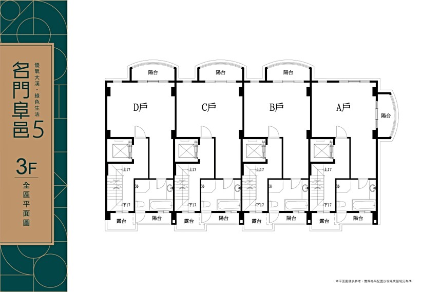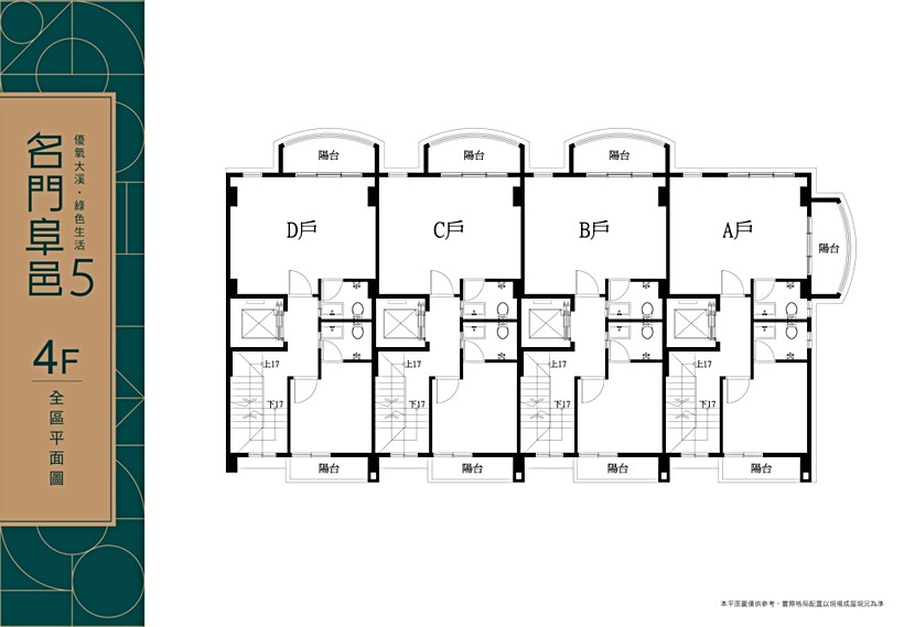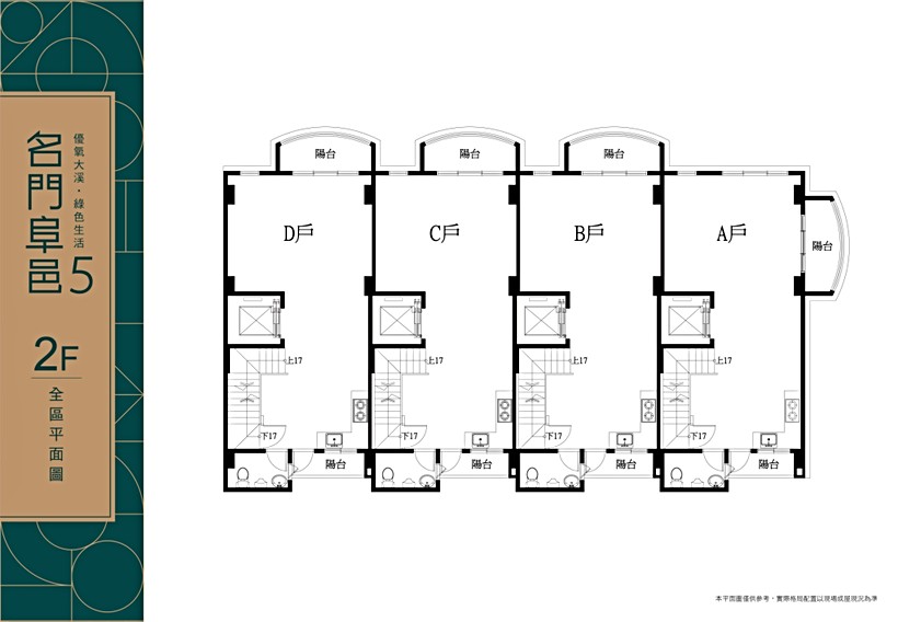 「名門阜邑5」2-5樓規劃雙陽台設計,A戶屬三面採光,B、C、D戶為雙面採光,2樓連接前陽台可以規劃大面寬客廳,電梯前方與廚房的空地可設置中島、餐廳位置;3樓可規劃主臥室的起居空間,連接衛浴可規劃更衣室,主衛浴為一件四式規劃;4樓可規劃兩間臥室的起居空間,樓梯旁臥室空間較小,可擺設單人床,增加收納空間;5樓因緊鄰電梯,可規劃公用空間或神明廳空間。