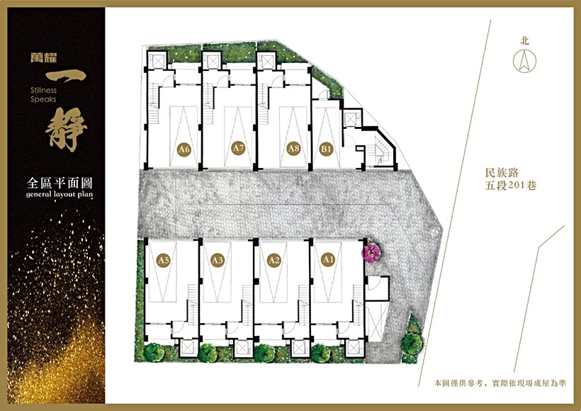 「萬耀一靜」單面臨民族路五段201巷,基地面積213.58坪,為住宅用地的RC鋼筋混凝土造電梯透天型產品,規劃地上5層共9棟建築,全社區8戶住家,皆採一樓前院停車模式,一大特色為每戶室內皆配有一電梯,無公共設施,公設比為0,格局規劃地坪24-27坪、建坪77-88坪,面寬皆為5米,室內皆為5房格局,在都市內,居住空間為寬敞的規劃。8戶中格局皆近乎相同,僅B1戶受限基地範圍,格局稍嫌不夠方正。
