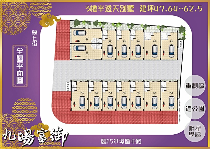 「九暘富御」基地雙面臨路,位在環區中路與學七街口,面積384.88坪,為2幢15棟地上4層連棟透天,共有14戶住家、1戶電信室,全案規劃地坪21.07~45.95坪、建坪47.64~62.5坪,面寬4.4~5.3米、縱深9.36~11米,戶戶3~5房產品,採1樓停車,屬於小型透天社區。