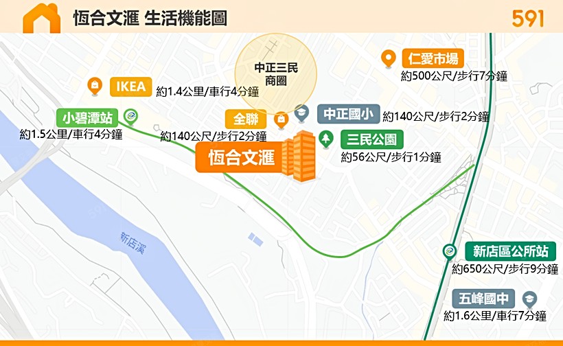 - 商業:到全聯及中正三民商圈約步行2分鐘,至仁愛市場約步行7分鐘,距離IKEA約車行4分鐘。