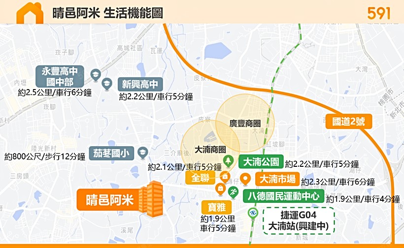 - 休閒:到大湳公園約車行5分鐘、八德國民運動中心4分鐘。