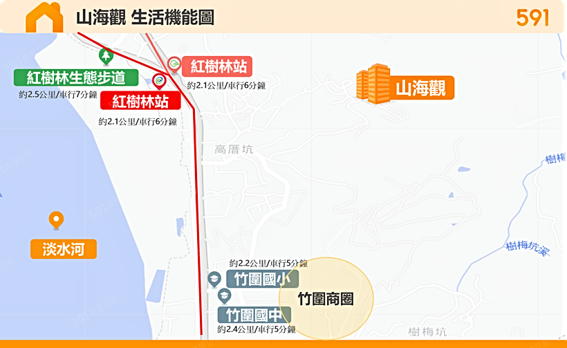學校:「山海觀」車行5分鐘就能到學區竹圍國小及國中。