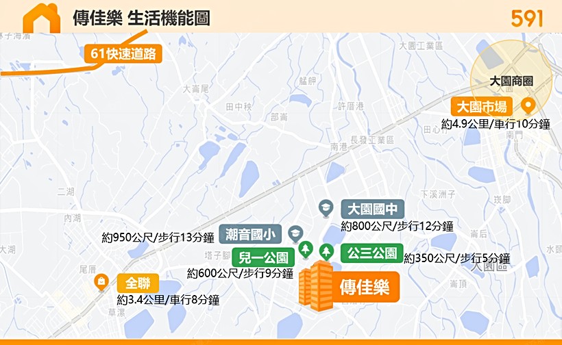 - 學校:步行12分鐘到大園國中、13分鐘有潮音國小。