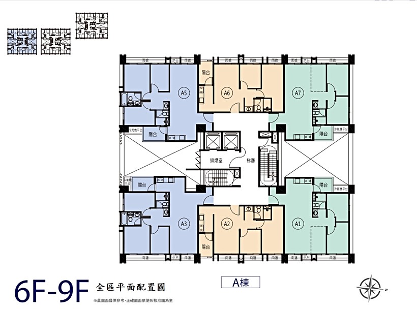 格局坪數規劃二房(25.68~27.29坪)、2+1房(30.9~32.34坪)、三房(35.49~37.37坪)、四房(45.57~48.27坪),其中A、B棟為鏡相設計,A1、A7、B3、B5、C3、C5戶為對稱3房,衛浴開窗,A2、A6、B2、B6、C2、C6戶為相似二房,衛浴採日式設計,洗手台在外,A3 、B7戶為類似三房,主臥衛浴開窗,A5/B1戶為對稱格局,雙衛浴開窗,C1、C7戶為相似四房,雙衛浴開窗。